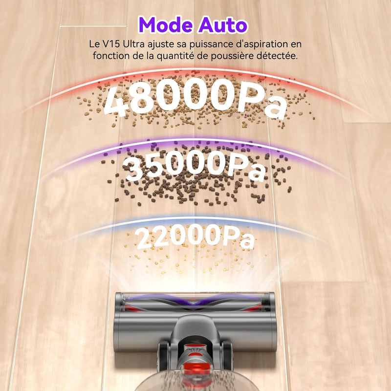 - Design à double écran : notre aspirateur sans fil V15 Ultra dispose d'un design à double écran amélioré. L'écran gauche affiche le niveau de batterie, tandis que l'écran droit affiche le mode d'aspiration. Les différents modes sont indiqués par des barres lumineuses ambiantes, vous permettant de surveiller clairement l'état de la batterie et la puissance d'aspiration.