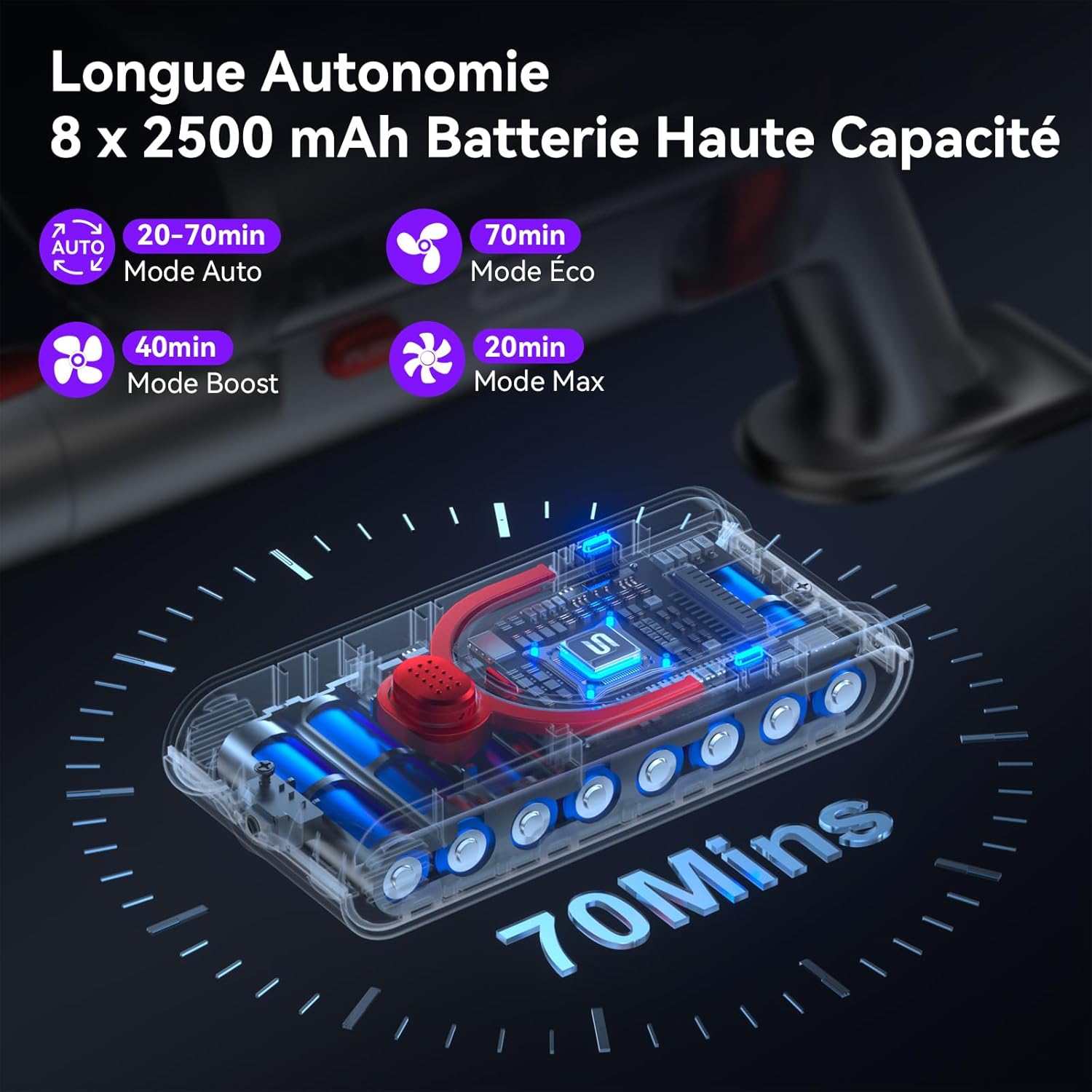 - 70 minutes d'autonomie : notre aspirateur rechargeable Vistefly est livré avec 8 batteries amovibles de 2500 mAh, offrant jusqu'à 70 minutes de temps de nettoyage en mode Eco. En mode Auto, il fournit 20 à 70 minutes de fonctionnement, ce qui est suffisant pour nettoyer toute une maison.